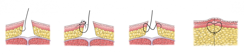 皮下反打结减张缝合运针步骤(深进浅出,对侧浅进深出):