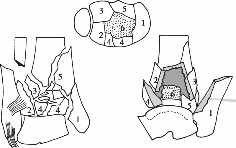 1.内侧骨块;2.前外侧Chaput骨块;3.后外侧Volkmann骨块;4.前侧骨块;5.后侧骨块;6.Die-punch骨块