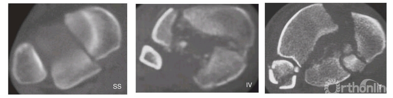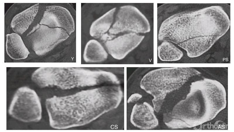 Topliss等分析了126例Pilon骨折患者中的108张CT片,提出了累及关节的6个主要骨块为前侧、后侧、内侧、前外侧(Tillaux-Chaput)、后外侧(Volkmann)和冲床样(Die-punch)骨折块。同时,他们根据主要骨折线的方向把骨折分为两大类(6%无法辨认,5%为边缘性骨折)。主要骨折线前后方向位于矢状面占33%(图18-2-6),可分为纵向分裂型(SS)、倒V型(IV)和T型(T),纵向分裂型为相对较低能量下出现的单一骨折线,后两者为能量继续增加造成的结果;主要骨折线内外方向位于冠状面占56%(图18-2-7),可分分为横向分裂型(CS)、前侧分裂型(AS)、后侧分裂型(PS,后Pilon骨折)、V型(V)和Y型(Y),后两者也是相对较高能量损伤的结果。他们认为,矢状面骨折通常存在内翻成角,常发生于高能量损伤的年轻患者;冠状面骨折倾向于存在外翻成角,常发生于低能量损伤的老年患者。