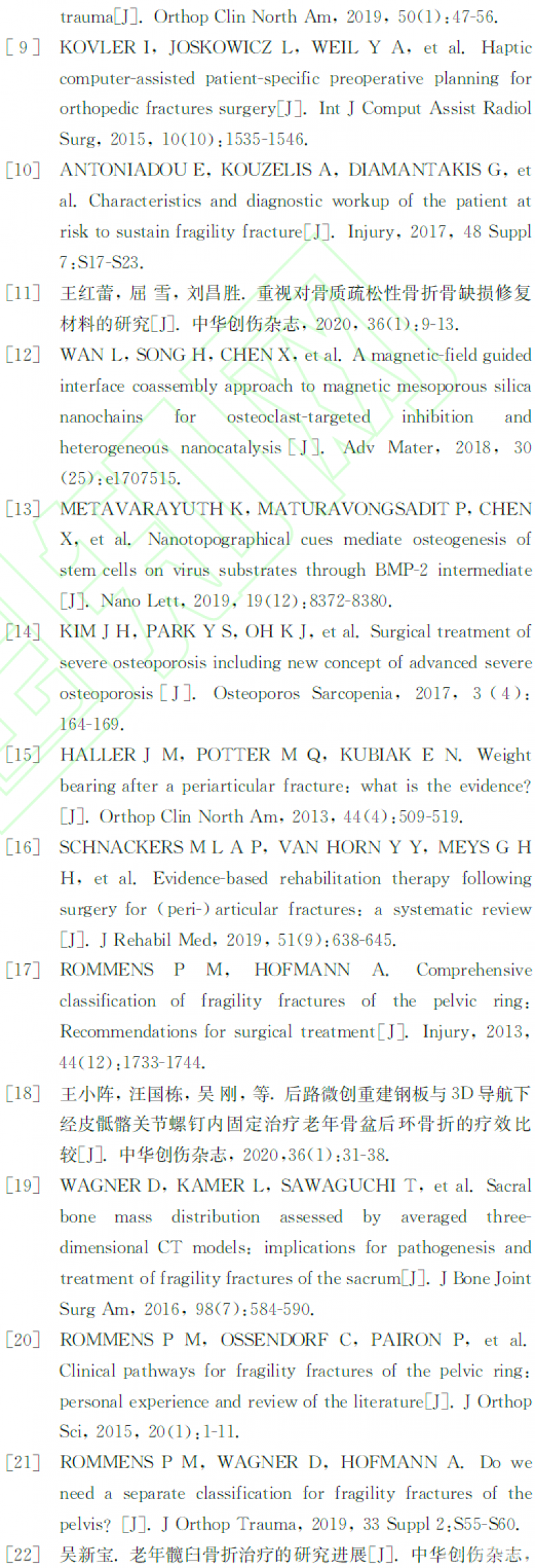 摘要:下肢关节周围骨质疏松性骨折好发于老年人,可带来运动功能丢失、骨缺损、内固定丢失等风险。区别于常规骨折的术后康复,下肢关节周围骨折要求良好的手术与康复治疗以恢复运动功能,而骨质疏松性骨折要求充分的医患沟通与个性化康复以规避内固定丢失风险。本共识着眼于下肢关节周围骨质疏松性骨折的特殊性,旨在平衡康复训练要求与安全性,促进下肢关节周围骨质疏松性骨折个性化诊疗与康复的推广普及。