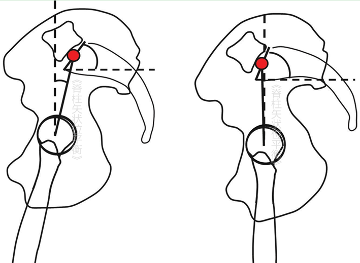 使骨盆围绕股骨头旋转是身体维持脊柱矢状位平衡重要的代偿机制。如果骨盆入射角(pelvisinc idence,PI)很小,骨盆则不能很好地围绕股骨头进行旋转。因此,形态学定义了骨盆的旋转能力及矢状位失平衡的代偿能力。