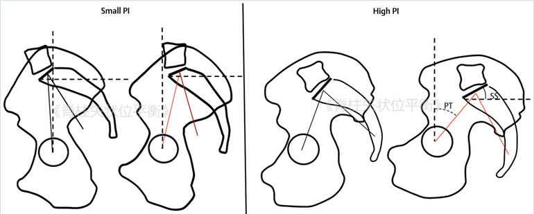 PI较小时,骶骨上终板位于股骨头上方,同髂嵴投射位置相近;当PI较大时,骶骨看起来似乎较小,骶骨上终板位于股骨头后方,相对于髂嵴位置更低