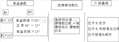 ①骨盆倾入射角水平;②骨盆倾斜角水平;③腰椎前凸长度和角度;④C7PL相对于股骨头和骶骨上终板的位置
