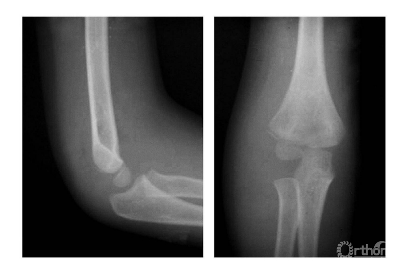 例:见肱骨小头及滑车骨骺伴前臂骨一同移向肘之尺侧,并略有旋转(图2)。