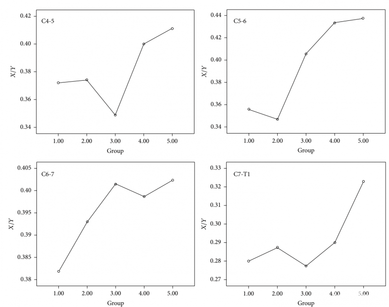 结果 在屈颈位MRI中,G2-G5组的C4-5节段的X/Y值明显增加,G1-G5组的C5-6,C6-7节段的X/Y值显著增加,G5组的C7-T1节段的X/Y值显著增加(P<0.05)。增加的X/Y程度以及屈颈位X/Y的值在5组间存在显著差异(P<0.05),这可能归因于平山病病程进展过程中X/Y值快速增加。