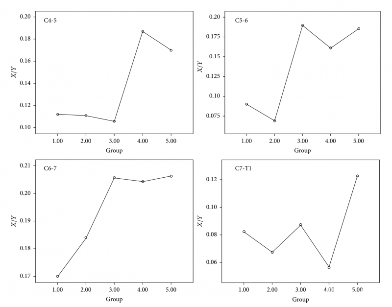 相对于颈椎中立位X/Y值,在G2-G5组的C4-5节段,屈颈后观察到明显X/Y值增加;上述测量值异常增加也出现在所有患者组(G1-G5)的C5-6及C6-7节段(图2,P<0.05)。而在C7-T1节段,屈颈后X/Y值的明显增加,仅发生在病程超过4年的患者中(G5组)。此外,屈颈位X/Y值在5组患者间(G1-G5)也存在显著差异(P=0.022,图3)。