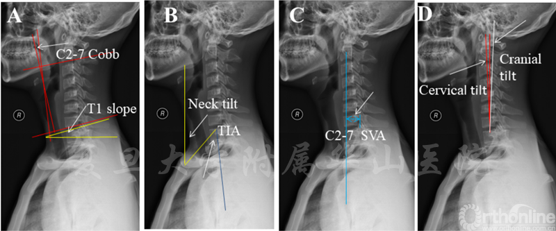 图1 侧位X线上标注矢状位参数;A:C2-C7 Cobb角:C2下终板垂线与C7下终板垂线的交角,T1倾斜角是水平线和上终板之间的角度;B:胸廓入射角(Thoracic inlet angle,TIA)是指T1上终板(T1 upper end plate, T1UEP)垂线与T1上终板中点和胸骨上端连线形成的角度;颈斜角是指胸骨顶端垂线与胸骨尖端至T1UEP重点之间的第二条线所形成的角度;C:C2-7矢状面轴向垂线(sagittal vertical axis. SVA)是从C2椎体中心垂直线到C7椎体后上角的距离;D:颈椎倾斜角是指T1UEP中心的垂线与从T1UEP中心延伸到C2中心的一条直线之间形成的角度;颅倾角是指从T1UEP中心到C2中心的连线与远离T1UEP中心的垂直线之间形成的角度。