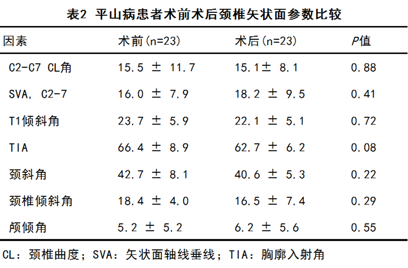 手术治疗可以纠正平山病患者矢状面不平衡,包括C2-C7 CL角度、C2-C7 SVA、T1倾斜角、TIA、颈倾角、颈椎倾斜角、颅倾角。