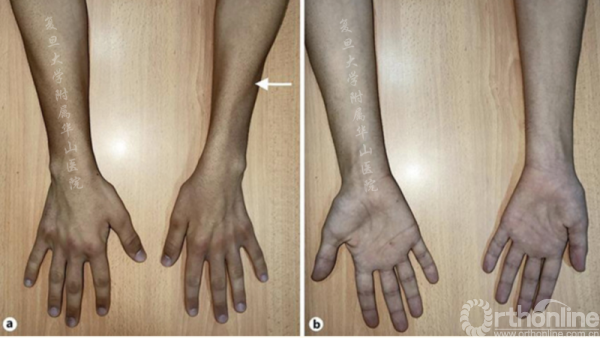 一名20岁男性,无相关病史,因左侧手及前臂无力、萎缩持续10个月而就诊。他的无力和萎缩最初从左手的小肌肉开始,逐渐发展到左前臂肌肉。上下肢均无其他肌肉受累,无任何疼痛、感觉丧失、上睑下垂、复视、吞咽困难、痉挛等症状。同时没有外伤史、发热、接触毒素或重金属、脊髓灰质炎病毒感染史,家族史也无特殊。