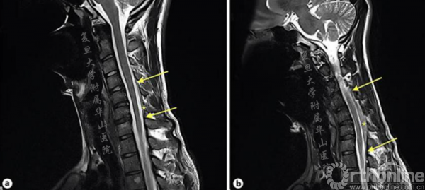 图2.MRI颈椎矢状位T2加权成像,a中立位,显示颈脊髓变直,C5-6水平节段的脊髓变细,可能反映脊髓萎缩;b过曲位,显示后硬膜前移,后硬膜空间扩大,“硬膜椎板间距离增加,从到1.4~6.1mm(*),脊髓长度增加()