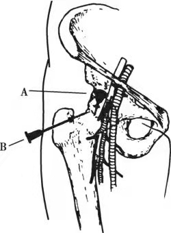 髋关节穿刺通常在前方(图20-0-4A)或侧方(图20-0-4B),个别情况下可在内侧。前方进针点位于腹股沟韧带中点下方约2cm处、股动脉外侧,垂直进针。X线透视下穿刺使髋关节穿刺更精确。但是通常脓液不容易穿出。如果局部和全身感染症状明显时,应及时外侧切开引流。