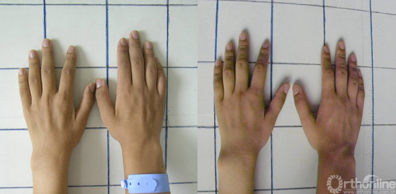 左:男性患者16岁,术前双手骨间肌萎缩