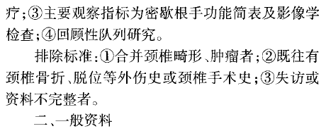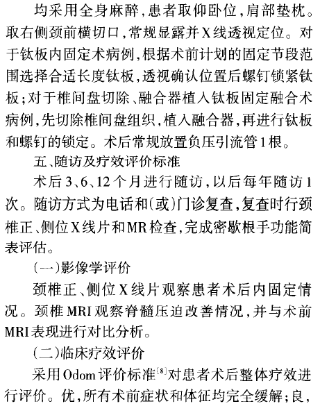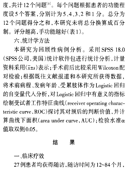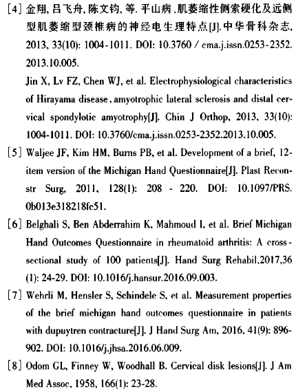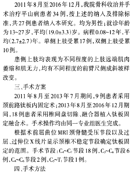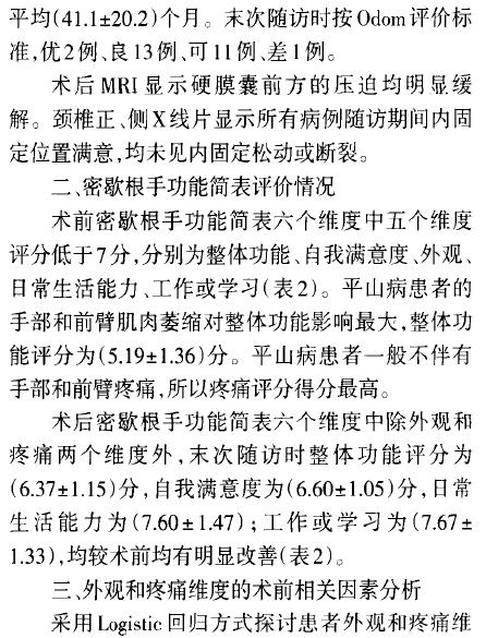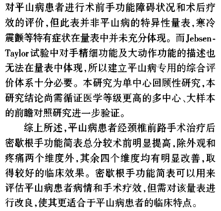 结论 颈椎前路手术治疗平山病患者取得较好的临床效果,密歇根手功能简表可以用来评估平山病患者术前手功能障碍状况和手术疗效。