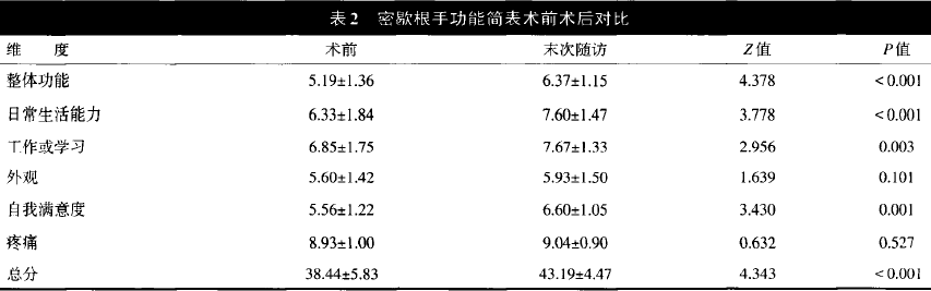 末次随访时密歇根手功能简表总分及其中4个维度较术前有明显改善,总、分由术前(38.44±5.83)分提高至(43.l9±4.47)分,整体功能由术前(5.l9±1.36)分提高至(6.37±1.15)分,自我满意度由术前(5.56±1.22)分提高至(6.60±1.05)分,日常生活能力由术前(6.33±1.84)分提高至(7.60±1.47),工作或学习由术前(6.85±1.75)提高至(7.67±1.33)分,差异均有统计学意义;而外观和疼痛两个维度手术前后的差异无统计学意义。