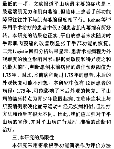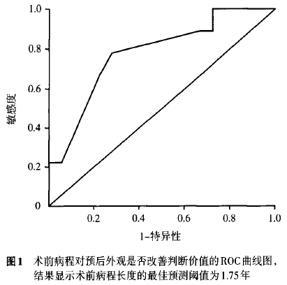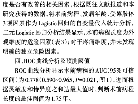 据文献报道术前病程、发病年龄、受累肢体可能影响平山病患者术后的疗效,故将此3项因素纳入二元Logistic回归分析,结果显示术前病程长度为外观维度的危险因素,术前病程长度的最佳预测阔值为1.75年。