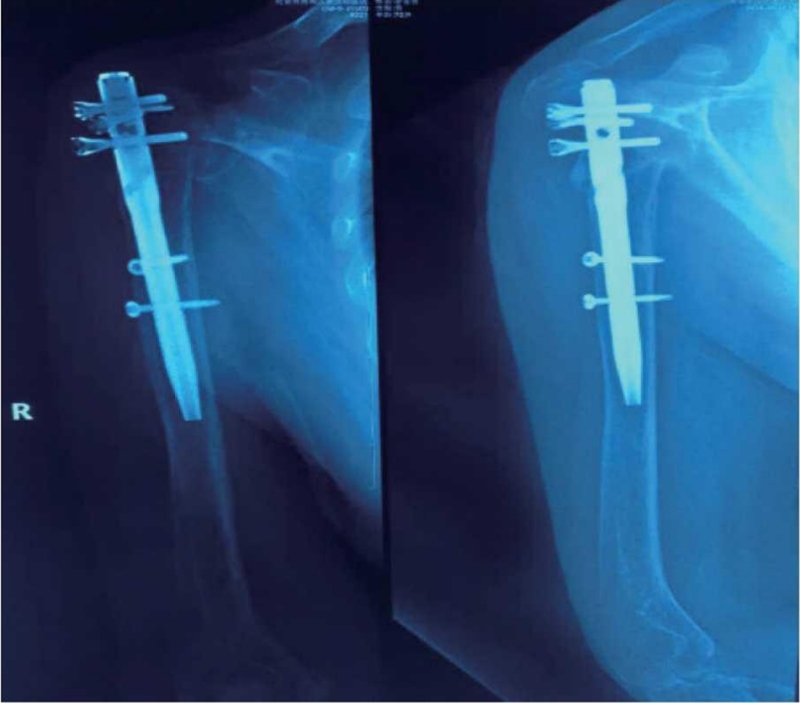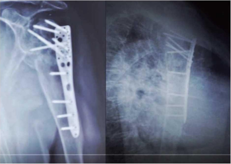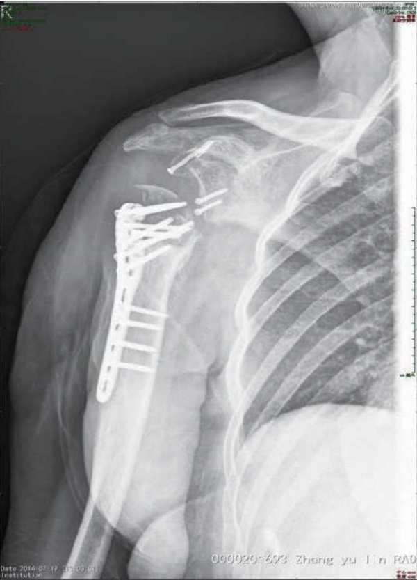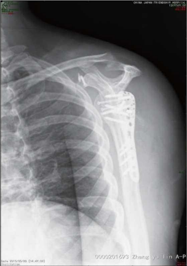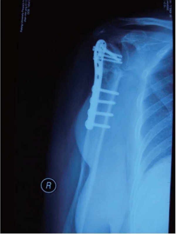 图8 术后X线片示右肱骨近端骨折复位满意,内固定位置良好