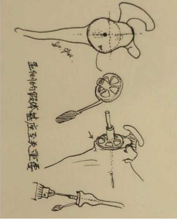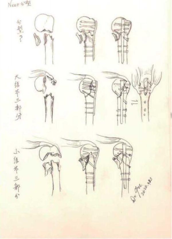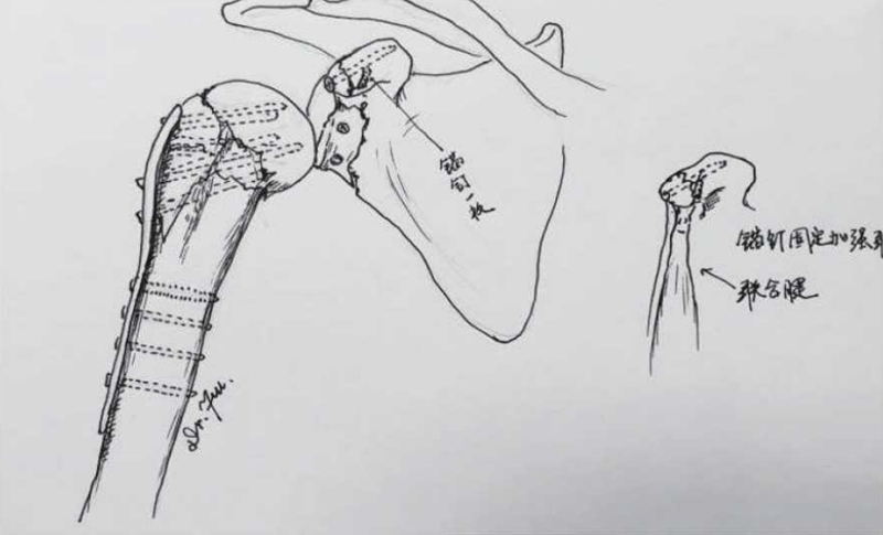 图7 术前手绘设计图,计划采用板钉固定肱骨近端,同时用空心钉及锚钉修复肩胛盂