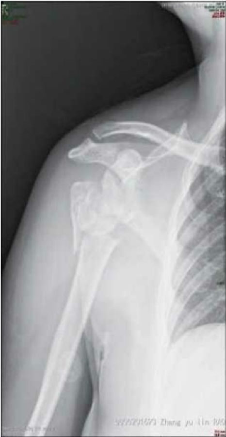 图11 肩关节X线片示肱骨近端骨折术后肱骨大、小结节吸收