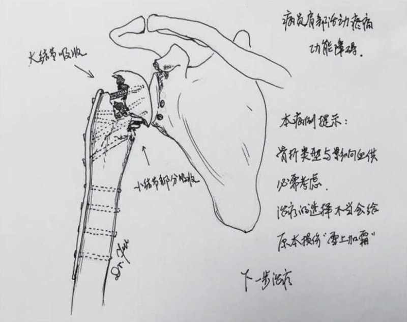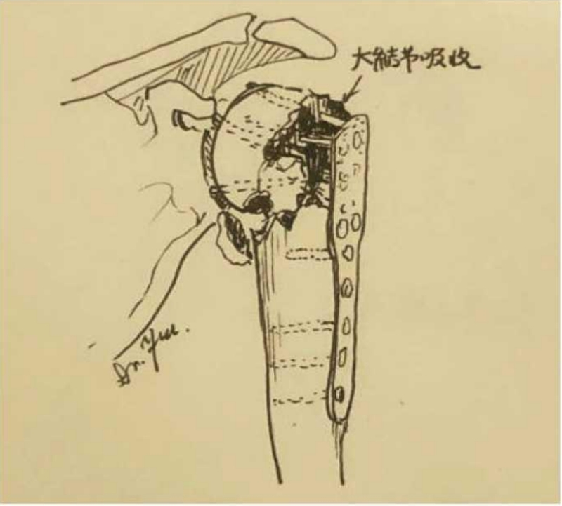 图12 手绘图示肱骨近端骨折术后大、小结节缺失