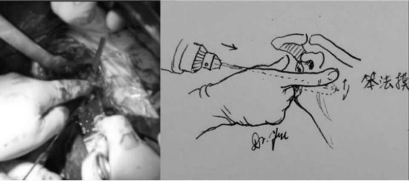 图16 用手触摸确定肩胛盂关节面,确定导针进针方向
