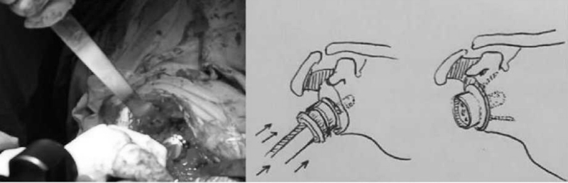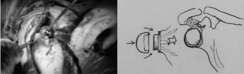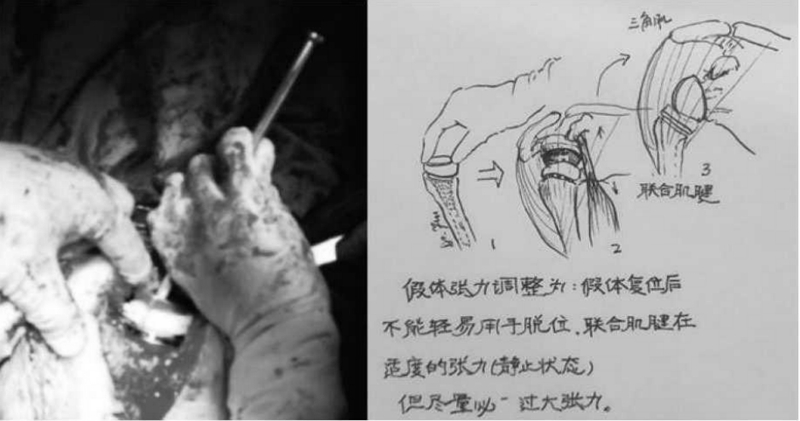图19 将肱骨头假体安装在盂假体基座上,应用辅助器打紧