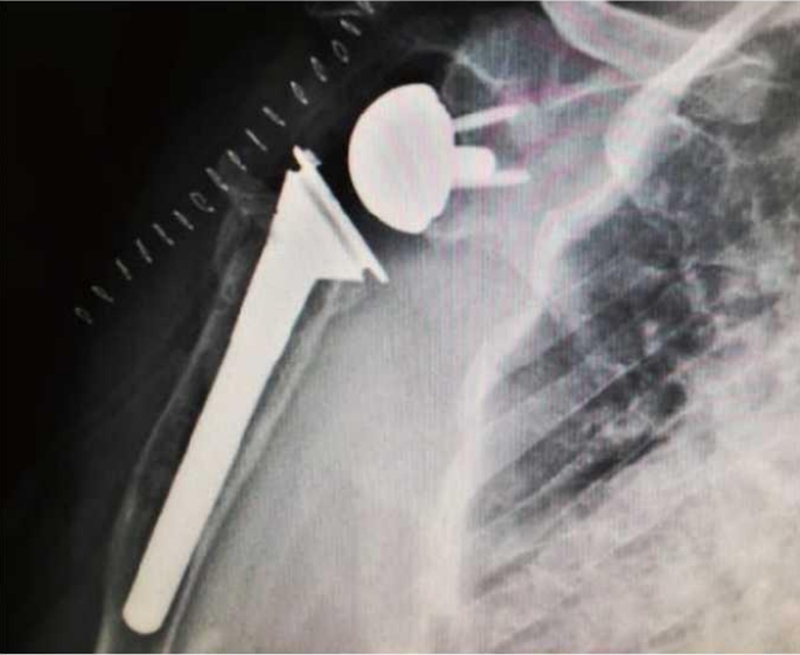图22 术后肩关节X线片示右肩关节假体位置良好