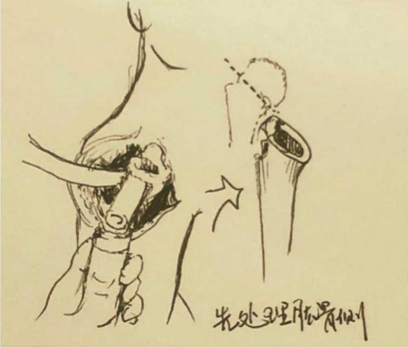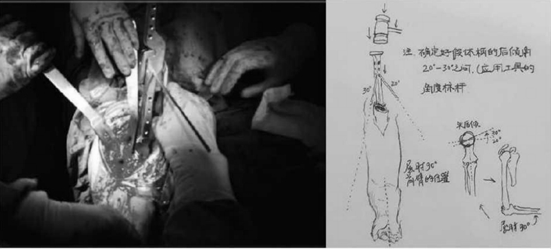 图20 确定好后倾角20°和合适高度后,打入生物型假体