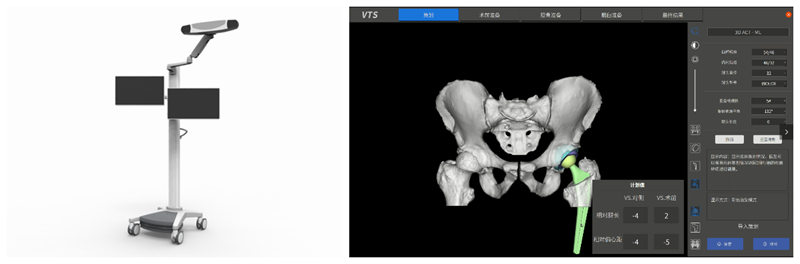 2021年4月20日,一款具有完全自主知识产权的国产导航系统(以下简称“VTS导航”)在北京大学第三医院投入临床应用。该导航系统不仅可以像国内外已上市的导航和机器人系统一样满足辅助初次全髋关节置换术手术的需求,而且将导航的适应证拓展到了对手术技术要求更高、更需要导航辅助的髋关节翻修领域,从术前金属伪影降噪、骨缺损识别、3D手术规划、脊柱僵硬度对髋臼位置的影响,到术中金属Augment、螺钉的可视化追踪以及髋臼假体植入等全流程进行辅助,使得该计算机导航系统达到国际领先水平。同时,该系统还具有体积较小、操作界面友好简洁、注册配准精确、操作步骤流畅等特点(图2)。