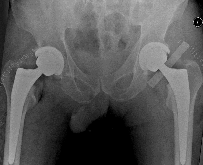 图4 患者术后X光片,假体位置和角度理想,下肢偏心距和长度得到了重建