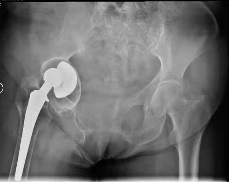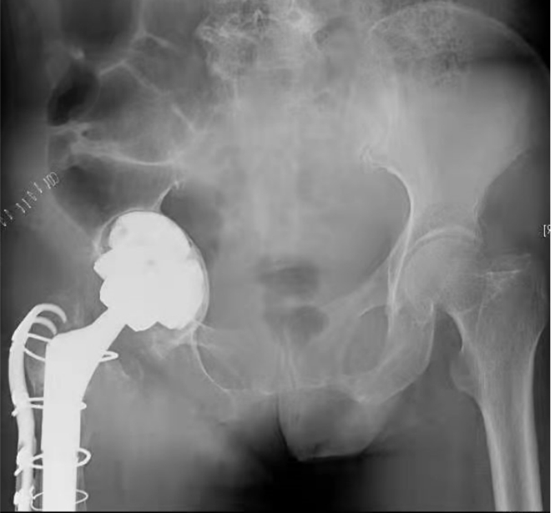 图5 患者术前X光片,右髋置换术后,现假体松动、严重髋臼侧骨缺损