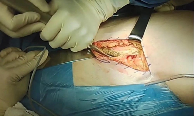 图1.“比基尼”皮肤切口和股外侧皮神经的识别(箭头标记)。