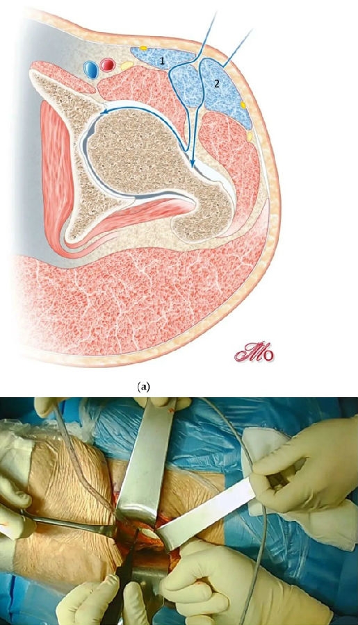 图3. a.打开第二个入路,向内侧拉开缝匠肌(1)向外侧拉开阔筋膜张肌(2)b.股直肌筋膜通过第一个入路暴露。