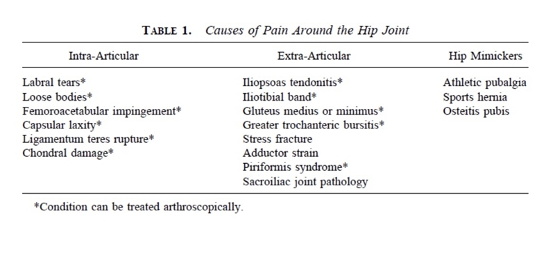 The differential diagnosis of hip pain is broad and includes intra-articular pathology,extra- articular pathology,and mimickers,including the joints of the pelvic ring.With the current advancements in hip arthroscopy,more patients are being evaluated for hip pain recent years, our understanding of the functional anatomy around the hip has improved addition,because ofadvancements in magnetic resonance imaging,the diagnosis of soft tissue causes of hip pain has improved.All of these advances have broadened the differential diagnosis of pain around the hip joint and improved the treatment of these problems. In this review.we discuss the causes of intra articular hip pain that can be addressed arthroscopically:labral tears,loose bodies femoroacetabular impingement,capsular laxity,tears of the ligamentum teres,and chondral damage.Extra-articular diagnoses that can be managed arthroscopically are also discussed,including: iliopsoas tendonitis, internal snapping hip,external snapping hip,iliotibial band and greater trochanteric bursitis,and gluteal tendon injury.Finally,we discuss extra-articular causes of hip pain that are often managed nonoperatively or in an open fashion: femoral neck stress fracture,adductor strain piriformis syndrome,sacroiliac joint pain athletic pubalgia,sports hernia,Gilmores groin,and osteitis pubis.