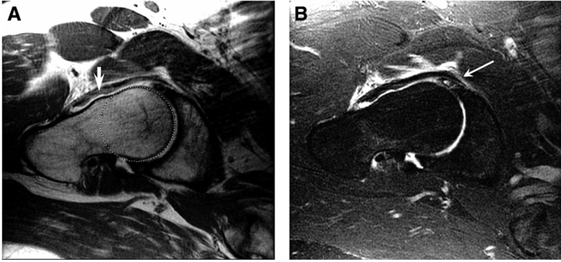 图1.盂唇撕裂经常与凸轮撞击有关,如这些T1和T2加权MRI扫描所示。