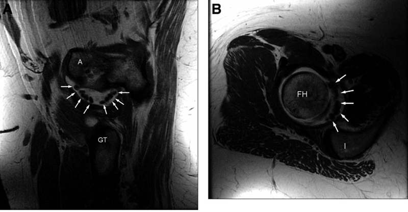 (A)髋关节滑膜软骨瘤病的矢状位和(B)轴向T1加权磁共振成像扫描。箭头表示关节囊内的游离体。(A 髖臼;FH 股骨头;GT 大转子;I 坐骨。)