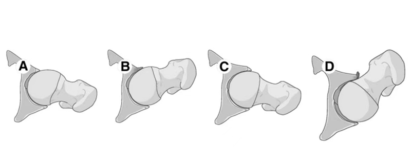 图3.(A)凸轮型股骨髋臼撞击症表明股骨头颈交界处的偏心距减小。(B)在屈曲和内旋时,头部的非球面部分在软骨/盂唇过渡区产生剪切,导致周围软骨损伤。(C)钳夹型股骨髋臼撞击症显示局部和/或整体髋臼过度覆盖。(D)在屈曲时,股骨颈紧靠髋臼边缘,挤压盂唇。随着时间的推移,髋臼中增生骨赘的慢性杠杄作用会导致后下髋臼的软骨损伤。