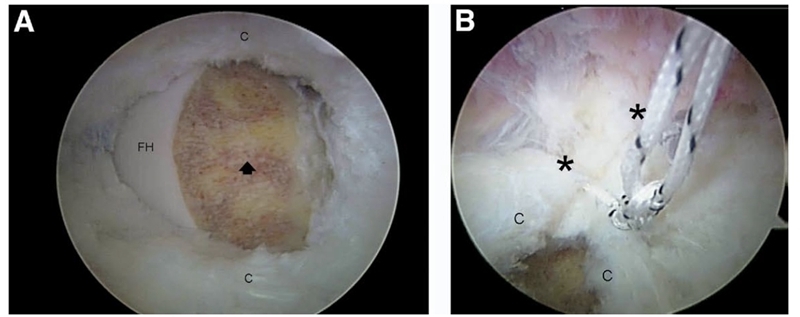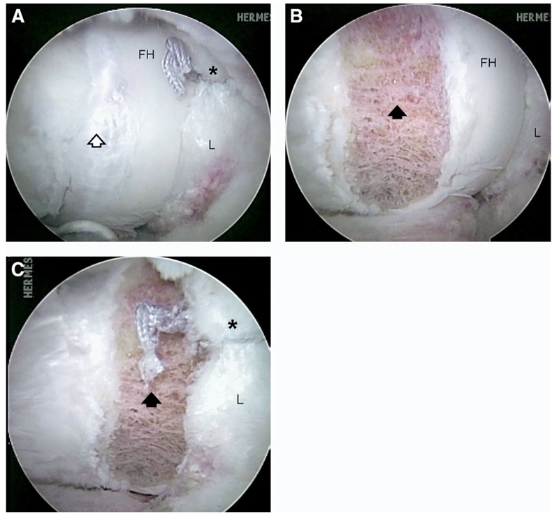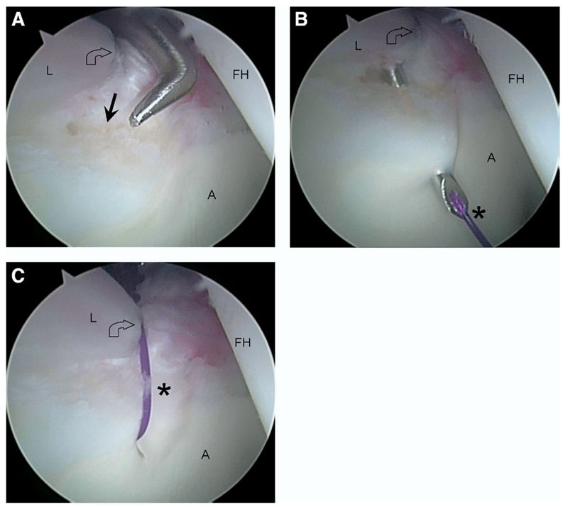 (A)邻近盂唇撕裂(已经修复,弯曲的开放箭头)的髋臼软骨分层(直箭头)的关节镜图像。(B)病变的基底部可以微骨折并用聚二恶烷酮缝合线(译者注:可吸收缝合线)(星号)缝合修复。(C)已完成的软骨修复(星号)直接覆盖盂唇修复(弯开箭头)。(A 髋臼;FH 股骨头;L 盂唇。)