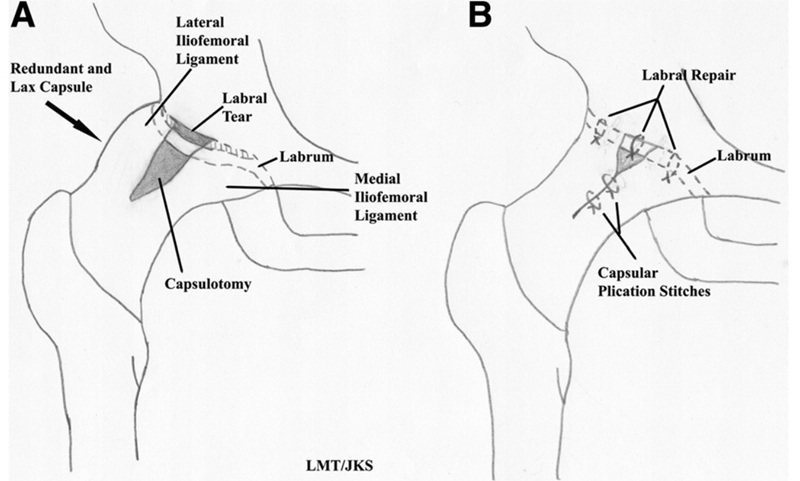 (A)以及随后的盂唇修复和关节囊折叠(紧缩缝合)术通过外侧和内侧髂带(B)可以恢复关节稳定性并解决疼痛。