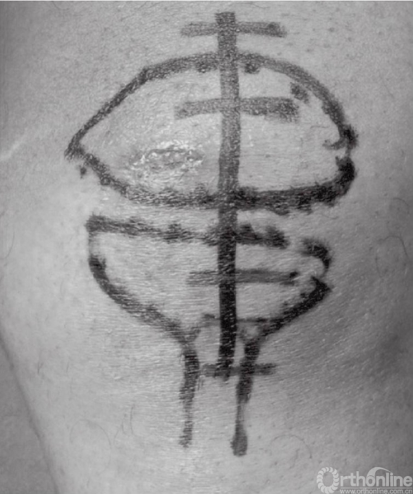 髌骨骨折可采用垂直切口、横行切口以及S型切口。具体采用哪种皮肤切口,主要基于术者的喜好。垂直切口是最常见的切口之一(图3),该切口的主要优势是伸展性比较好,尤其是在粉碎性髌骨骨折中(近端和远端都有累及),更有利于骨折显露。