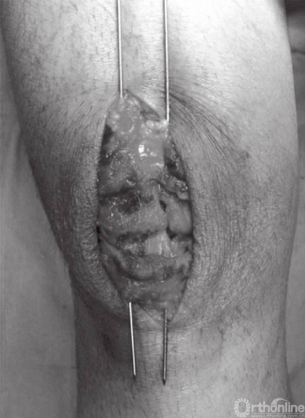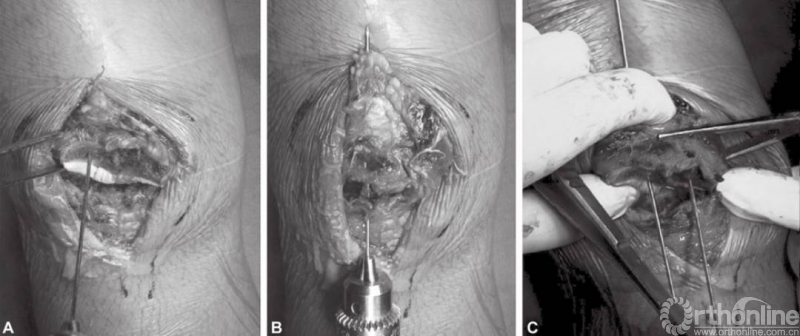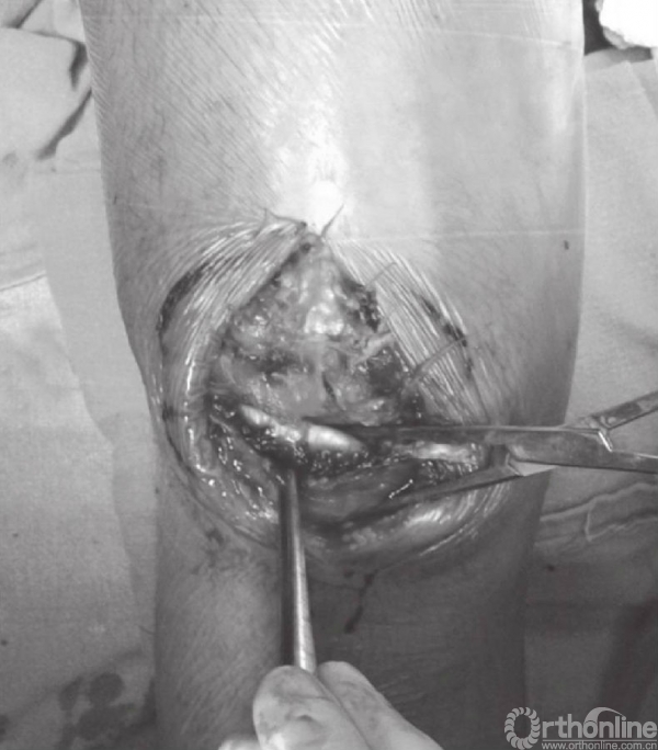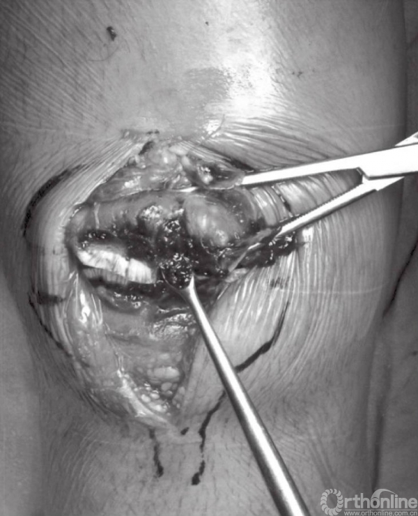 骨折末端应以小挂勺以及吸引器清除局部的血凝块。骨折端处的骨膜以及韧带应分离至骨折线周围2~3cm处,以免影响骨折复位。但应注意,不要清除髌骨周围过多的软组织,因为常有骨折块包含其中。
