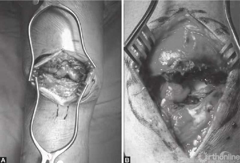 图4 A和B切开髌骨关节囊,清除血肿后显露骨折块。图示髌骨横断型骨折,可见韧带撕裂