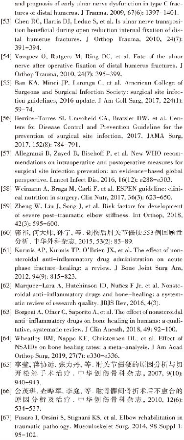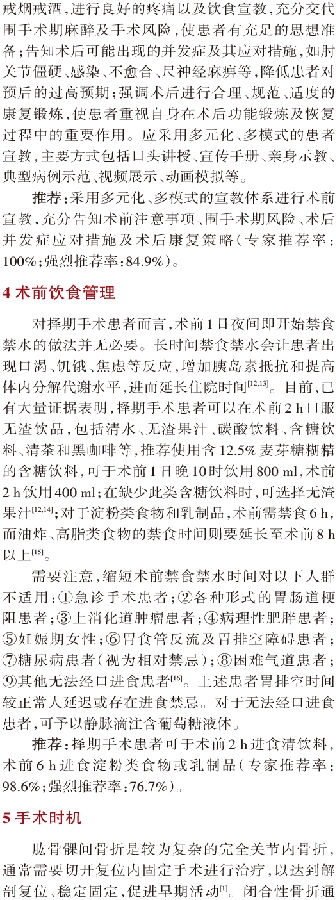 肱骨髁间骨折是一类常见且复杂的骨折,治疗难度大,并发症多。目前对于此类骨折的治疗获得了较大的进展,但仍存在很多不规范的地方,尤其在围手术期处理方面。在加速康复外科(ERAS)理念的指导下,对围手术期处理流程进行全面优化可以进一步提高治疗效果。因此,经全国创伤骨科专家讨论,以循证医学证据为基础,以ERAS理念为指导,特制定该共