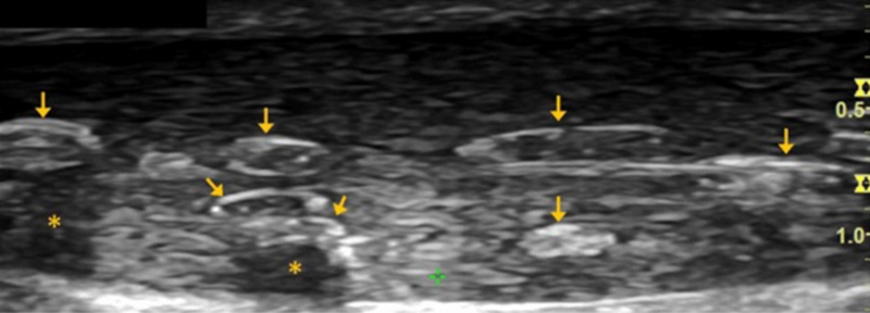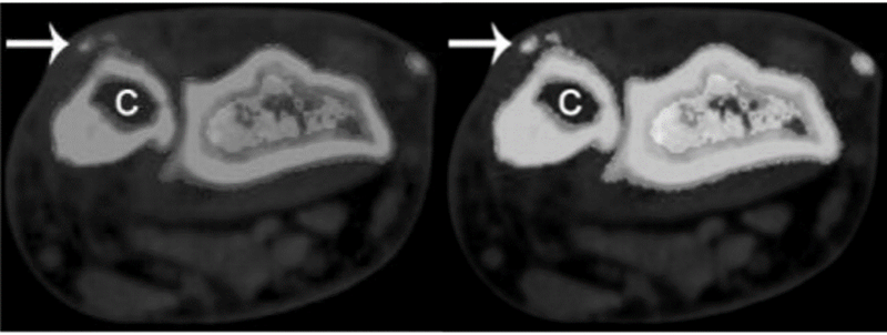 图2.双能计算机CT断层扫描显示远尺桡关节焦磷酸钙沉积