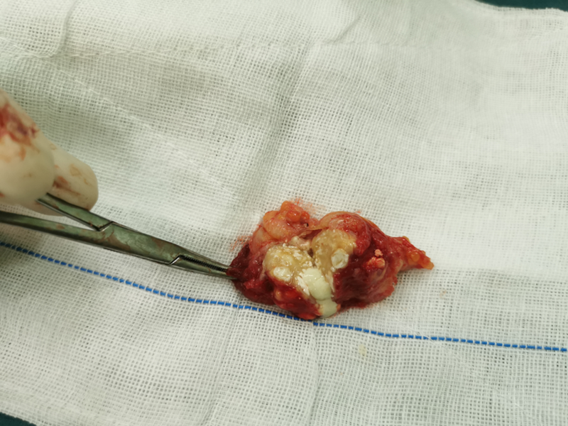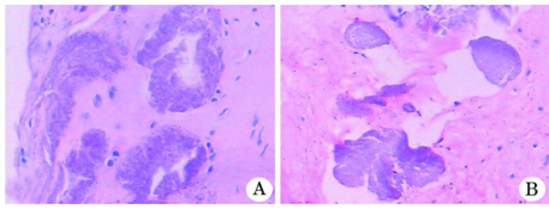 图4.膜组织内见多灶、团块状紫蓝色钙化结晶体沉积