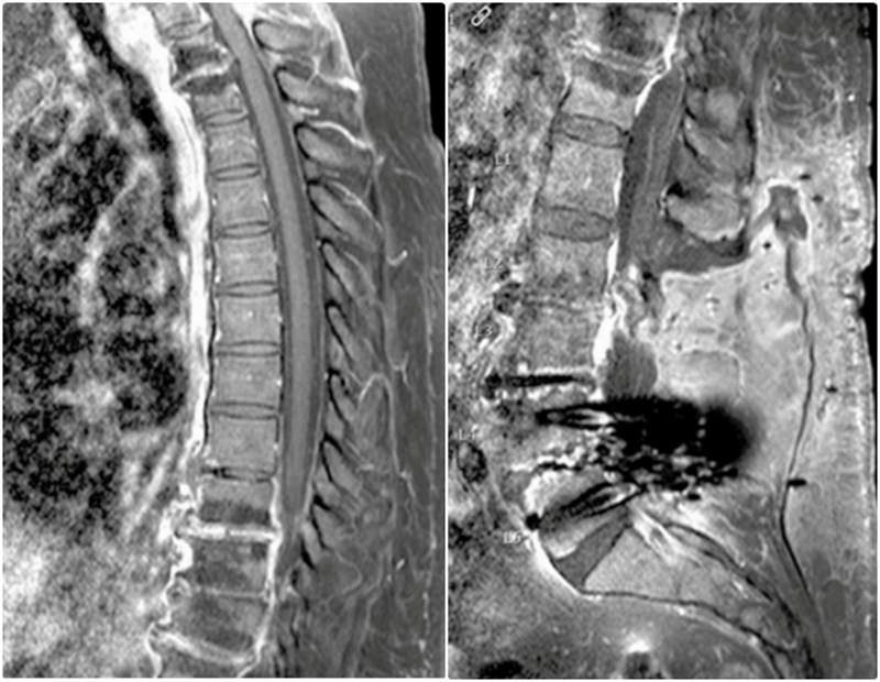 胸椎(A)和腰椎(B)脊柱MR图像显示C7-T1以及T1-2和T9-12椎间盘内有一些强化。从T9到T12也有腹侧硬膜外强化