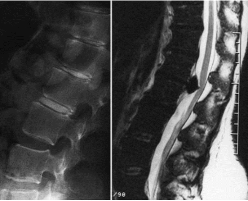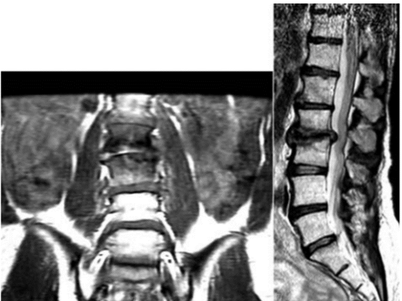 腰椎MRI,L2/3明显狭窄,左侧明显,伴椎间盘炎和中度硬膜囊压迫,周围可见软组织水肿,左侧腰大肌轻度水肿。