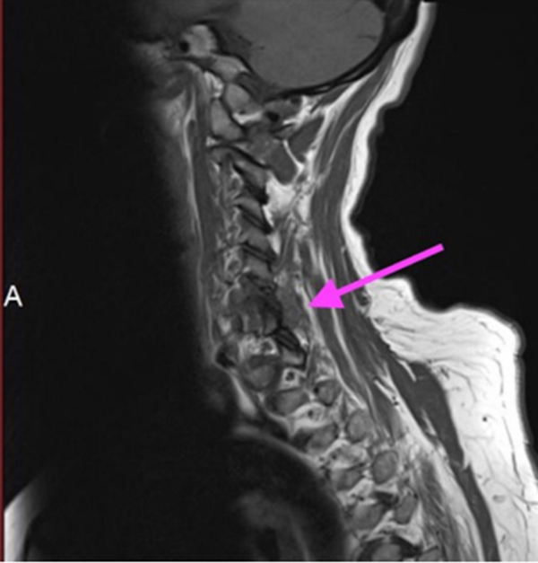 C6/7椎板关节面不规则,骨髓信号减弱,椎周信号改变延伸至C6神经根的后侧和C7神经根的上侧