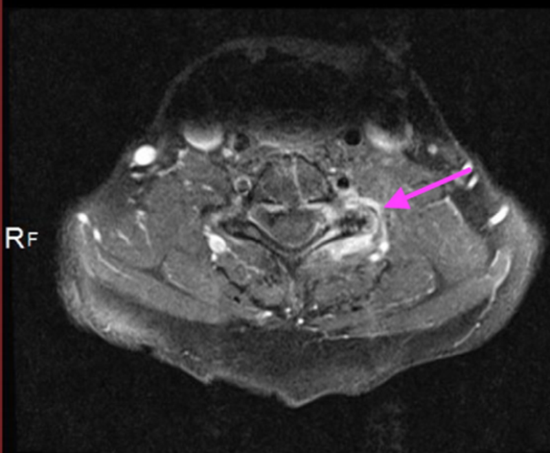 箭头显示在椎间后关节周围和左侧C6/7神经孔内的炎症过程增强