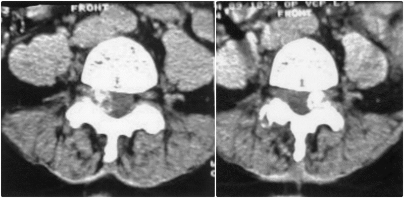 CT扫描显示右侧与L4-L5关节突关节相关的钙化滑膜囊肿,明显侵犯椎管