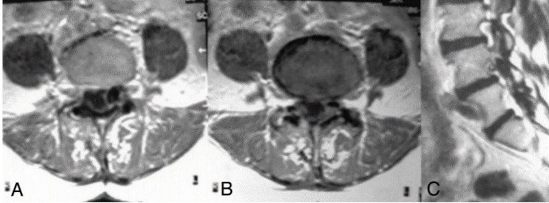 A、注射钆前轴位T1加权MRI扫描显示硬膜囊背侧有低信号钙化肿块移位;B、注射钆后,低信号区周围可见强化环;C、矢状位T2加权MRI图像。箭头显示侧隐窝内有囊性肿块